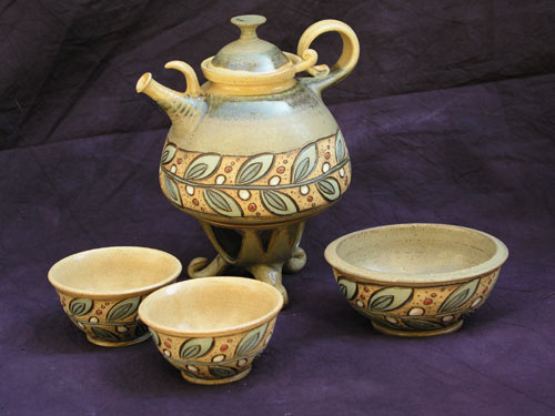 -vyrábíme standardně ve velikostech cca od 0,5 – 1,5 . (nebo na přání zákazníka). Je určena k přípravě čajů bylinných ( pro tento účel je konvička opatřena keramickým sítkem), sáčkových nebo i sypaných ( v tomto případě doporučujeme použít externí sítko). Ohříváček pod čajovou konvice je určen k udržení teploty čaje v konvici okolo 50° C Šálek na čaj – především jako součást čajové soupravy milovníkům a znalcům tohoto nápoje Může být s uchem nebo bez ucha. Čajovou soupravu lze rovněž doplnit o podšálky, misky na dobroty a jiné.